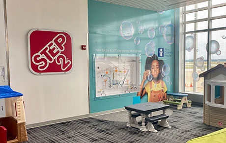 Step2, a Northeast Ohio company that makes toys, indoor playsets and outdoor activity sets, has created a jumbo–sized activity area where your young ones can run, skip, slide, teeter–totter and burn off some of that energy before your flight.